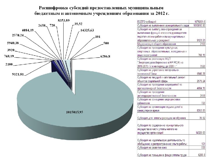 Подраздел 0113 «Другие общегосударственные вопросы» Направление расходов Сумма Субвенция на выполнение отдельных государственных полномочий по комплектованию, хранению, учету и использованию документов Архивного фонда РС (Я) Субвенция на реализацию ФЗ № 125 «О жилищных субсидиях гражданам, выезжающим из районов крайнего севера и приравненных к ним местностей» от 25. 10. 2002 г. № 125 -ФЗ % 534, 0 0, 7 11, 9 0, 0 Субвенция на выполнение отдельных полномочий по исполнению функций административных комиссий 1854, 6 2, 3 Субсидия на общереспубликанское движение добрых дел "Моя Якутия в XXI веке" в сумме Субсидия на на подготовку генеральных планов поселений республики и схем территориального планирования муниципальных районов республики Субсидия на разработку местных нормативов градостроительного проектирования муниципальных образований 8500, 0 10, 6 3110, 0 3, 9 493, 0 0, 6 Субсидия на софинансирование муниципальных инвестиционных проектов Иные межбюджетные трансферты - возврат в местные бюджеты поступивших средств от денежных взысканий (штрафов) по административным правонарушениям 7767, 5 9, 7 73, 2 0, 1 12294, 3 13448, 9 8332, 3 2998, 0 15, 3 16, 7 10, 4 3, 7 Средства, переданные бюджетам поселений в связи с передачей бухгалтеров Целевые программы 1556, 5 5217, 5 1, 9 6, 5 Увеличение уставного капитала ОАО «Кировский угольный разрез» Аренда помещения За счет программы содействия СЭРНР За счет поступлений от спонсорской помощи Приобретение транспортных средств Оплата коммунальных услуг имуществ, находящихся в муниципальной собственности в сумме 1 082, 0 тыс. руб. , По исполнительному листу ОАО "Сахатранснефтегаз" Уплата земельного налога Курсы повышения квалификации Издание книги ИТОГО 5000 201, 16 4179, 1 188, 9 924, 0 6, 2 0, 3 5, 2 0, 2 1, 1 829, 9 1676, 7 1050, 7 95, 3 97, 2 80434, 7 1, 0 2, 1 1, 3 0, 1 100 МКУ «Централизованная бухгалтерия бюджетных учреждений» , "Управление делами" МКУ «Комитет имущественных отношений» МКУ «Инвестиционно-строительное управление" Строительные работы ЛЭОК "Кыталыктаах"