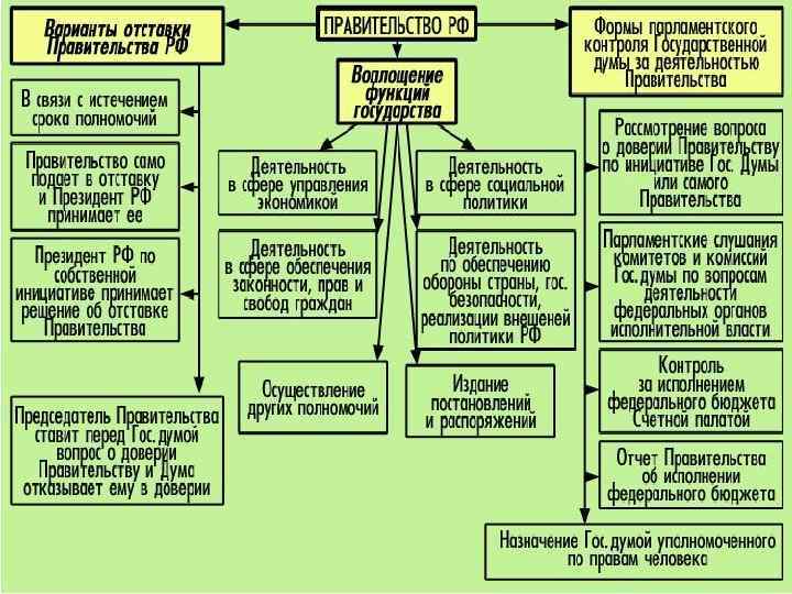 Полномочия Правительство (статья 114 Конституции РФ) : • • разрабатывает и представляет Государственной думе федеральный бюджет и обеспечивает его исполнение, предоставляет отчет об исполнении бюджета, а также предоставляет ежегодные отчеты о результатах своей деятельности; обеспечивает проведение в государстве единой финансовой, кредитной и денежной политики; обеспечивает проведение единой государственной политики в области культуры, науки, образования, здравоохранения, социального обеспечения, экологии; осуществляет управление федеральной собственностью; осуществляет меры по обеспечению обороны страны, государственной безопасности, реализации внешней политики государства; осуществляет меры по обеспечению законности, прав и свобод граждан, охране собственности и общественного порядка, борьбе с преступностью; осуществляет иные полномочия, возложенные на него Конституцией Российской Федерации, федеральными законами, указами президента Российской Федерации. На основании и во исполнение Конституции Российской Федерации, федеральных законов, нормативных указов президента Российской Федерации правительство издает постановления и распоряжения, обеспечивает их исполнение. Подзаконные постановления и распоряжения правительства обязательны к исполнению в Российской Федерации. Постановления и распоряжения правительства в случае их противоречия Конституции Российской Федерации, федеральным законам и указам президента Российской Федерации могут быть отменены президентом Российской Федерации.
