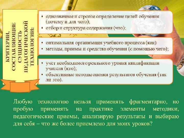 НАИБОЛЕЕ ЧАСТО ИСПОЛЬЗУЕМЫЕ МНОЮ ТЕХНОЛОГИИ Информацио ннокоммуни кационные (ИКТ) Учебноисследователь ская деятельность Здоровьесб ерегающие технологии Технологии интегрирова нного обучения Личностноориентирова нные технологии Проектная деятельность (индивидуальн ая, групповая, коллективная) Технологии применяются не вместо методов обучения, а наряду с ними, так как они являются составной частью методики предмета. .