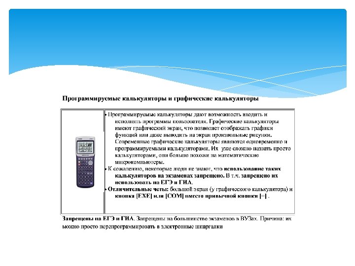 Непрограммируемые калькуляторы Непрограммируемый калькулятор должен обеспечивать выполнение всех арифметических действий (сложение, вычитание, умножение, деление), вычисление квадратного корня и тригонометрических функций (sin, cos, tg ). Конструктивные особенности калькуляторов должны исключать возможность получения экзаменующимися дополнительной информации, не предусмотренной условиями проведения ЕГЭ: их коммуникационные возможности не должны допускать беспроводного обмена информацией с любыми внешними источниками, сохранения в своей памяти баз данных экзаменационных заданий и их решений, а также любой другой информации, знание которой прямо или косвенно проверяется на экзамене; получения извне информации во время сдачи экзамена.