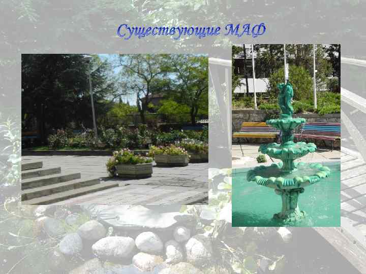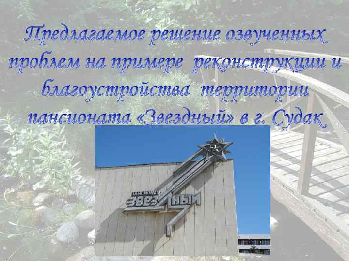 Актуальность темы В данное время далеко не все оздоровительные учреждения отличаются единством стиля в благоустройстве, а это – немаловажная составляющая в общем образе как комплекса учреждений, так и облика всего курорта в целом Цели работы q Сделать акцент на актуальность поставленной проблемы; q Привести примеры некорректного использования МАФ Задача работы Предложить корректный вариант благоустройства на примере разработки территории пансионата «Звездный» в г. Судак