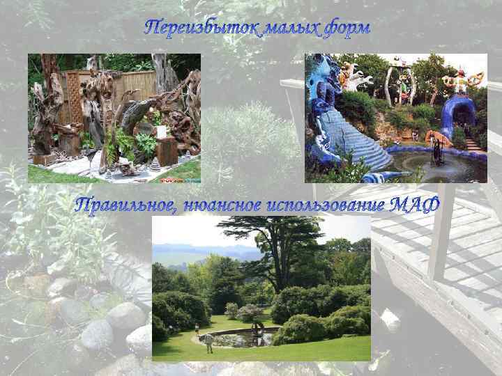 Выводы по проведенной работе: В работе были озвучены основные правила и принципы размещения малых форм На существующих примерах были рассмотрены основные недостатки в использовании МАФ На примере реконструкции участка пансионата продемонстрирован вариант оформления территории по индивидуальному заказу
