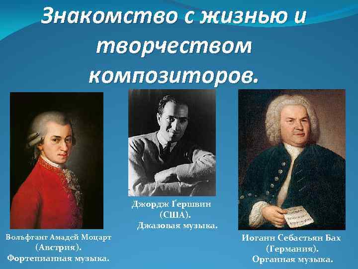 Знакомство с жизнью и творчеством композиторов. Джордж Ґершвин (США). Джазовая музыка. Вольфганг Амадей Моцарт (Австрия). Фортепианная музыка. Иоганн Себастьян Бах (Германия). Органная музыка.