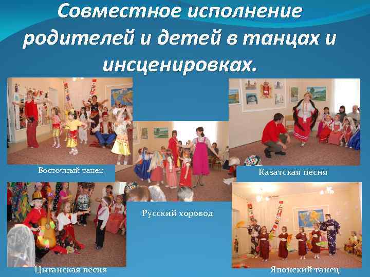Совместное исполнение родителей и детей в танцах и инсценировках. Восточный танец Казатская песня Русский хоровод Цыганская песня Японский танец