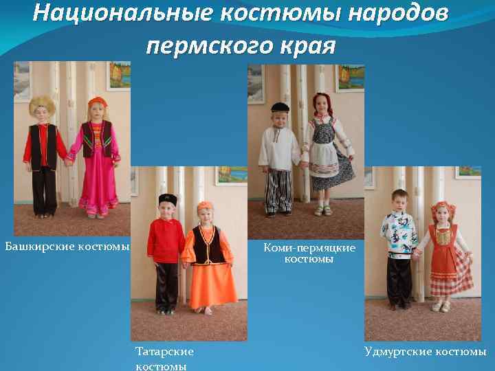 Национальные костюмы народов пермского края Башкирские костюмы Коми-пермяцкие костюмы Татарские костюмы Удмуртские костюмы