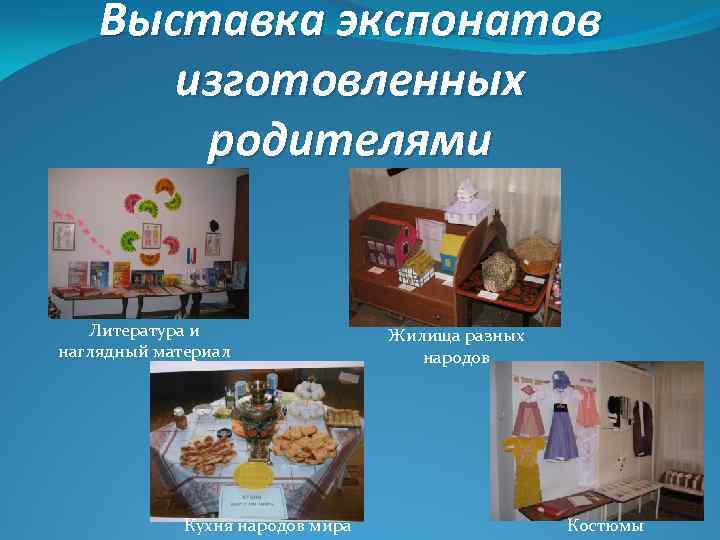 Выставка экспонатов изготовленных родителями Литература и наглядный материал Кухня народов мира Жилища разных народов Костюмы