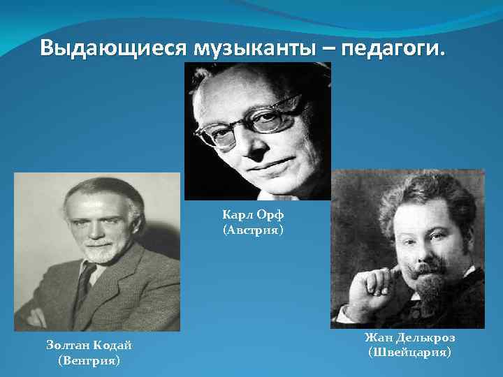 Выдающиеся музыканты – педагоги. Карл Орф (Австрия) Золтан Кодай (Венгрия) Жан Делькроз (Швейцария)