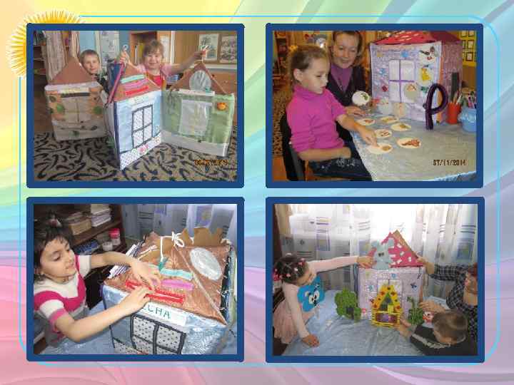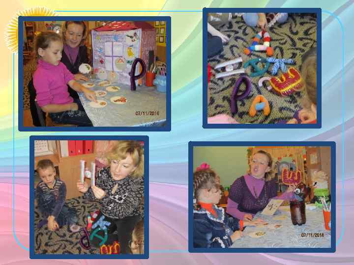 Многофункциональное модульное пособие «Избушкараскладушка» Состоит из модульных каркасов стен и крыши, обтянутых разноцветной тканью и соединённых между собой змейками, шнурками, крючками и липучками. Домик имеет 16 рабочих поверхностей (8 - внутренние и внешние стены, 8 - внешние и внутренние крыши). Внешние 4 стены соответствуют временам года и имеют карманы с различными дидактическими карточками с клеящимися поверхностями. Внутренние 4 стены в оформлении соответствуют следующей тематике: грамота, развитие математических представлений, сенсорики, и звукопроизносительных навыков. Все рабочие поверхности крыши оформлены с целью развития мелкой моторики (шнуровка, плетение кос, змейки, кнопки, пуговицы, липучки). • Цель: используется при формировании и уточнении пространственновременных представлений, развитии лексико-грамматической стороны реки, при коррекции звукопроизношения. Вариант игры: В гостях у «Свистящей семейки» . Назвать все изображения в названии, которых есть заданный звук. Помоги звуку поселиться в домике, пройди по дорожке правильно называя, предметы которые ему встречаются. Проговори правильно чистоговорку используя звуковые тропинки, лабиринты и т. д.