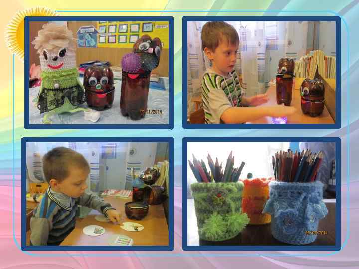 «Разнообразные ёмкости из бросового материала для картотек тематических картинок и раздаточного материала» Выполнены из половинок пластиковых бутылок разной ёмкости скреплённых между собой застёжкой-молнией. Оформлены в виде забавных человечков. Ряд ёмкостей имеет тканевую основу или обвязаны крючком. Цель: эстетическое оформление ёмкостей для дидактического и раздаточного материала, используется в моментах театрализации при коррекции звукопроизношения.