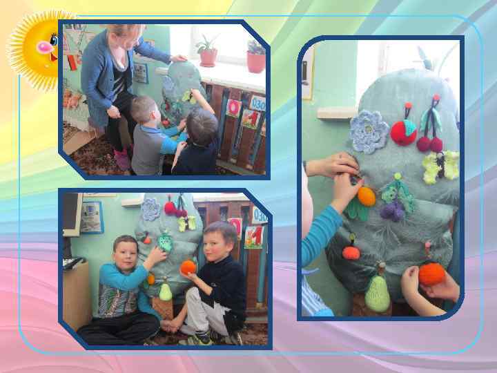 «Многофункциональное сенсомоторное панно «Чудодерево» Представляет собой деревянный каркас в форме дерева обтянутый тканью. Имеет съемные, наполненные разнофактурным набивным материалом объёмные детали в виде фруктов, овощей, цветов, насекомых и т. д. Все детали крепятся на пуговицы разных размеров. Панно выполнено вручную в технике вязание крючком. • Цель: данная методика применяется для развития мелкой моторики дошкольников на подготовительном этапе по постановке звука, а так же на этапе автоматизации, дифференциации. Может использоваться как в индивидуальной работе, так и подгрупповой. • Вариант игры: В корзине фрукты и ягоды: виноград, гранат, груша, банан, абрикос, персик, вишня и т. д. Ребёнку предлагается украсить дерево только теми фруктами и ягодами в названии которых есть звук [ р ], [ с ], [ ш ] и т. д.