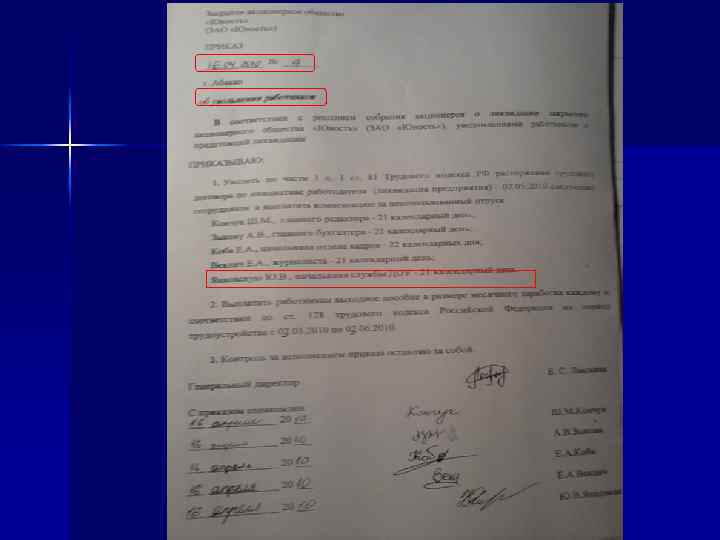 Оформление ответа Архивная справка Закрытое акционерное общество «Юность» (ЗАО «Юность» ) АРХИВНАЯ СПРАВКА 19. 04. 2010 № 1 г. Абакан В документах архивного фонда «ЗАО «Юность» имеются следующие сведения о Янковской Юлии Валерьевне: Янковская Юлия Валерьевна была принята на работу 20. 09. 2009 на должность секретарь руководителя на основании приказа о приеме № 2 от 29. 09. 2009. Была переведена на должность инспектор службы ДОУ – приказ о переводе № 1 от 18. 01. 2010. Поощрений и взысканий не имела. Уволена 02 мая 2010 года по ч. 1, ст. 81 Трудового кодекса Российской Федерации (о ликвидации организации) на основании приказа № 9 от 16 апреля 2010 года. Основание: ф. 45, оп. 2, д. 11, лл. 11 -12. Генеральный директор £ Е. С. Лыскина