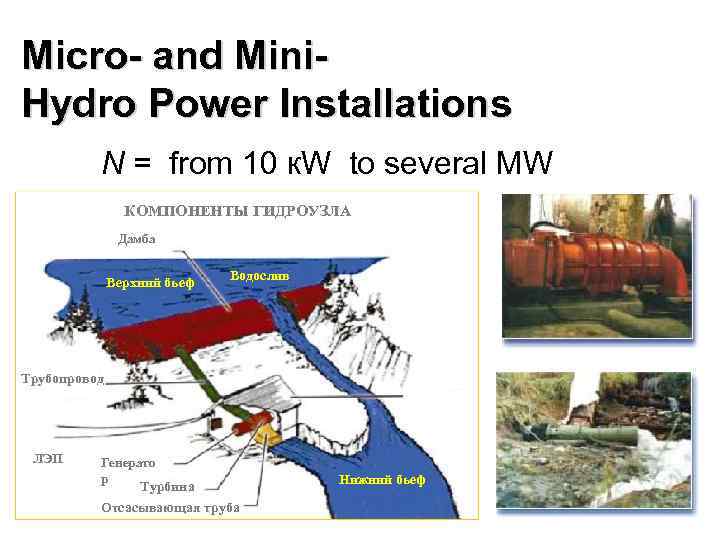 Micro- and Mini- Hydro Power Installations N = from 10 к. W to several MW КОМПОНЕНТЫ ГИДРОУЗЛА Дамба Верхний бьеф Водослив Трубопровод ЛЭП Генерато р Нижний бьеф Турбина Отсасывающая труба