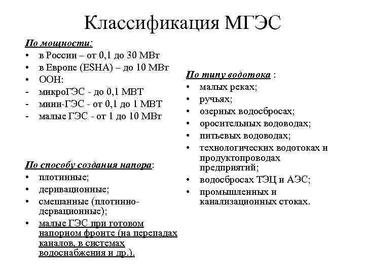 Классификация МГЭС По мощности: • в России – от 0, 1 до 30 МВт • в Европе (ESHA) – до 10 МВт • ООН: По типу водотока : - микро. ГЭС - до 0, 1 МВТ • малых реках; - мини-ГЭС - от 0, 1 до 1 МВТ • ручьях; - малые ГЭС - от 1 до 10 МВт • озерных водосбросах; • оросительных водоводах; • питьевых водоводах; • технологических водотоках и продуктопроводах По способу создания напора: предприятий; • плотинные; • водосбросах ТЭЦ и АЭС; • деривационные; • промышленных и • смешанные (плотинно- канализационных стоках. дервационные); • малые ГЭС при готовом напорном фронте (на перепадах каналов, в системах водоснабжения и др. ).