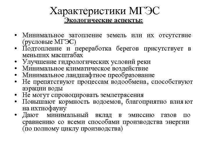 Характеристики МГЭС Экологические аспекты: • Минимальное затопление земель или их отсутствие (русловые МГЭС) • Подтопление и переработка берегов присутствует в меньших масштабах • Улучшение гидрологических условий реки • Минимальное климатическое воздействие • Минимальное ландшафтное преобразование • Не препятствуют процессам водообмена , способствуют аэрации воды • Не могут спровоцировать землетрясения • Повышают кормность водоемов, благоприятно влия ют на ихтиофауну • Дают минимальный вклад в эмиссию газов по сравнению со всеми способами производства энергии (по полному циклу производства)