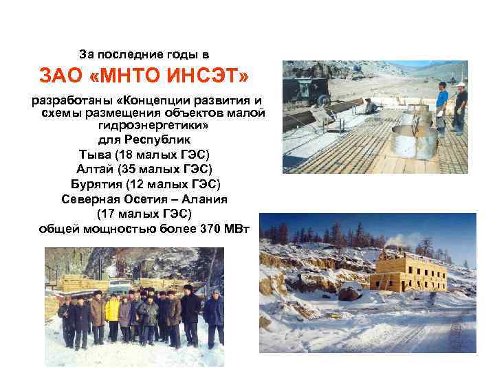 За последние годы в ЗАО «МНТО ИНСЭТ» разработаны «Концепции развития и схемы размещения объектов малой гидроэнергетики» для Республик Тыва (18 малых ГЭС) Алтай (35 малых ГЭС) Бурятия (12 малых ГЭС) Северная Осетия – Алания (17 малых ГЭС) общей мощностью более 370 МВт