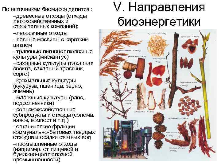 По источникам биомасса делится : V. Направления –древесные отходы (отходы лесохозяйственных и строительных компаний); биоэнергетики –лесосечные отходы –лесные массивы с коротким циклом –травяные лигноцеллюлозные культуры (мискантус) –сахарные культуры (сахарная свекла, сахарный тростник, сорго) –крахмальные культуры (кукуруза, пшеница, зерно, ячмень) –масляные культуры (рапс, подсолнечники) –сельскохозяйственные субпродукты и отходы (солома, навоз, компост и т. д. ) –органические фракции коммунально-бытовых твердых отходов и осадки сточных вод –промышленные отходы (например, от пищевой и бумажно-целлюлозной промышленности)