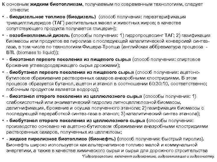 К основным жидким биотопливам, получаемым по современным технологиям, следует отнести: • - биодизельное топливо (биодизель) (способ получения: переэтерификация триацилглицеридов (ТАГ) растительных масел и животных жиров; в качестве сопутствующего продукта получается глицерин); • - возобновляемый дизель (способы получения: 1) гидропроцессинг ТАГ; 2) газификация биомассы или продуктов ее пиролиза с последующей каталитической конверсией синтез- газа, в том числе по технологиям Фишера-Тропша (английская аббревиатура процесса - BTL (biomass to liquid)); • - биоэтанол первого поколения из пищевого сырья (способ получения: спиртовое брожение углеводсодержащего сырья дрожжами); • - биобутанол первого поколения из пищевого сырья (способ получения: ацетоно- бутиловое сбраживание растворенных сахаров анаэробными клостридиями. В этом процессе образуется бутанол, ацетон и этанол в соотношении 60: 30: 10, соответственно; побочным продуктом является водород); • - биоэтанол второго поколения из целлюлозного сырья (способы получения: 1) слабокислотный или энзиматический гидролиз лигноцеллюлозной биомассы, делигнификация, брожение и осушка полученного этанола; 2) газификация биомассы с последующей переработкой синтез-газа в этанол; 3) каталитический синтез этанола); • - биобутанол второго поколения из целлюлозного сырья (способы получения: производство основано на ацетоно-бутиловом сбраживании анаэробными клостридиями растворенных сахаров, полученных из целлюлозы; • - жидкое пиролизное биотопливо (бионефть) (способ получения: быстрый пиролиз). Бионефть широко используется как альтернативное топливо малой и коммунальной энергетики, а также в качестве химического сырья и сырья для дорожного строительства *Гидропроцессинг включает гидрокрекинг, гидрогенизацию и гидроочистку.