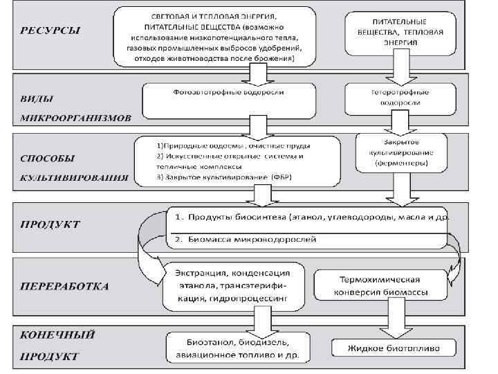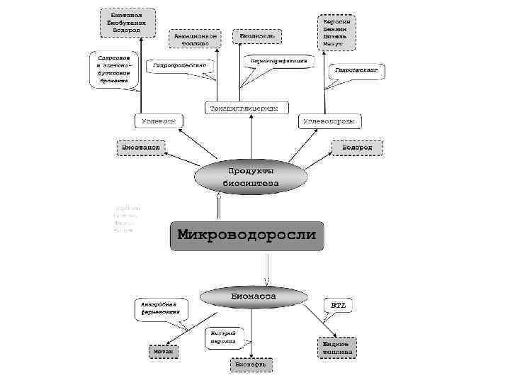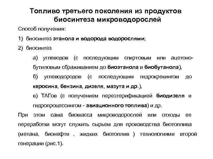 Топливо третьего поколения из продуктов биосинтеза микроводорослей Способ получения: 1) биосинтез этанола и водорода водорослями; 2) биосинтез а) углеводов (с последующим спиртовым или ацетоно- бутиловым сбраживанием до биоэтанола и биобутанола), б) углеводородов (с последующим гидрокрекингом до керосина, бензина, дизеля, мазута и др. ), в) ТАГов (с получением переэтерификацией биодизеля и гидропроцессингом - авиационного топлива) и др. При этом сама биомасса микроводорослей или отходы ее переработки могут служить сырьем для производства биотоплива (метана, бионефти , жидких биотоплив ) технологиями второй генерации (рис. 1).