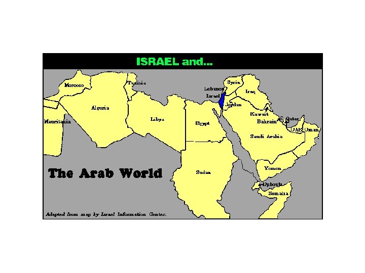 UN Partition Resolution - 1947 • Jews were a majority in the area allotted to them by the resolution* – 538, 000 Jews – 397, 000 Arabs • Jews were a majority in Jerusalem • Israel accepted the resolution • Arabs rejected it – “I declare holy war” – the Mufti of Jerusalem – Armies of 5 Arab states attacked Israel • Israel victorious after 15 months of fighting, but 6, 000 Jews were killed (nearly 1% of the population) **Howard Sachar, A History of Israel From the Rise of Zionism to Our Time, p. 292