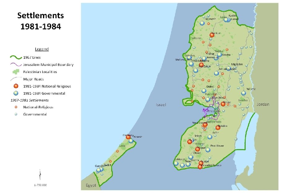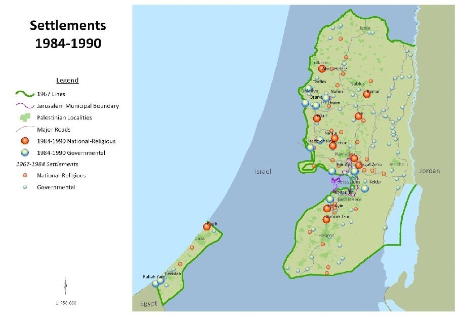 The Yesha Council’s Founding Covenant (1981) • Ongoing action to enforce Israeli sovereignty over all parts of the land of Israel. • Resisting any other political solution. • The Council rejects the establishment of a non-Israeli soveregin administration in parts of the land of Israel… State lands and water resources are national assets of the Jewish people and therefore the Council rejects and denounces any proposal to share control over such assets with a foreign element. The Council will act to thwart such proposals. • The Council considers any proposal whose purpose is to transfer parts of the land of Israel to a foreign sovereign element a denial of the designation of the Jewish People, the missions of the Jewish people, and an illegal act…”
