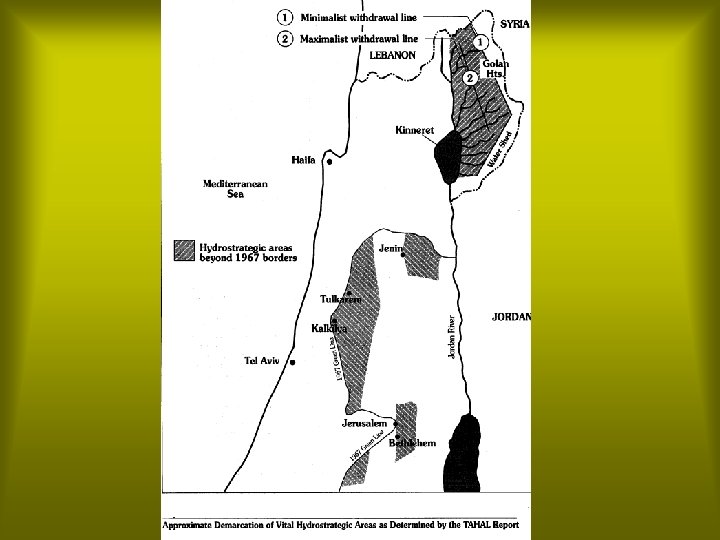 Wells within Israel proper were tapping this water long before the Six-Day War. But as the population and water demand on both sides of the Green Line have grown, the control of the western slopes has attained a new and vital importance for Israel. It is the rain falling on the West Bank that recharges the aquifer; [A]ny new wells drilled between the recharge area and the Israeli taps could cut off supply and, by lowering the water tables in the part of the aquifer that extends to the west of the Green Line, allow saline water from greater depths to seep in, permanently ruining what is left” US News & World Report, 16. 12. 91.