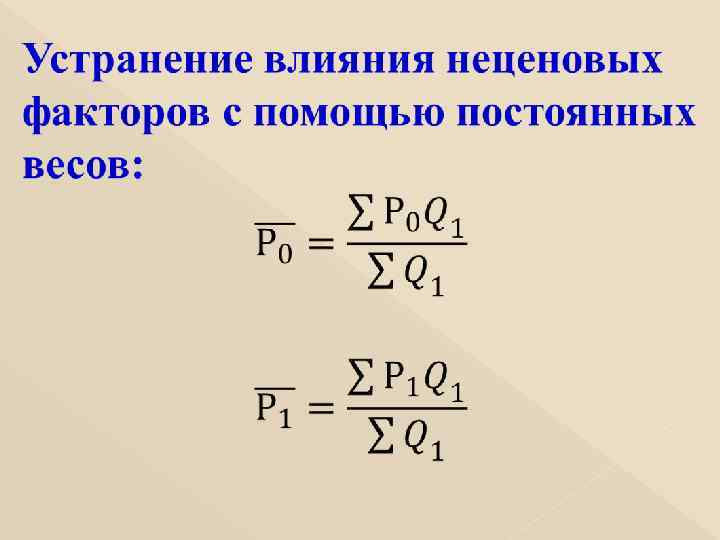 Устранение влияния неценовых факторов Виды Оптовая цена за 1 м, Количество Структура проду- руб. проданного товара количества, % кции Базисный Отчетный период период Ситец 7500 900 1000 56 45 Сатин 12500 12300 700 1200 44 55 1000 1200 10227, 27 1000 1200