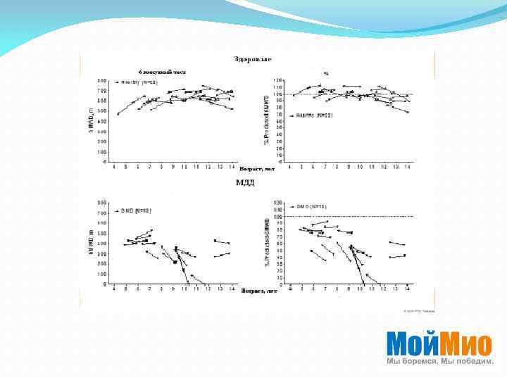 МДД МДБ Отсутствие/нефункциональный дистрофин ― тяжелый фенотип МДД Короткий/частично функциональный/уменьшение количества дистрофина― умеренный фенотип МДБ Специфичные мутации могут приводить к вариациям фенотипа Кореляция генотип/фенотип не превосходна и не легка Клиническая картина и анализ дистрофина лучшие помощники в установлении прогноза и прогрессирования болезни