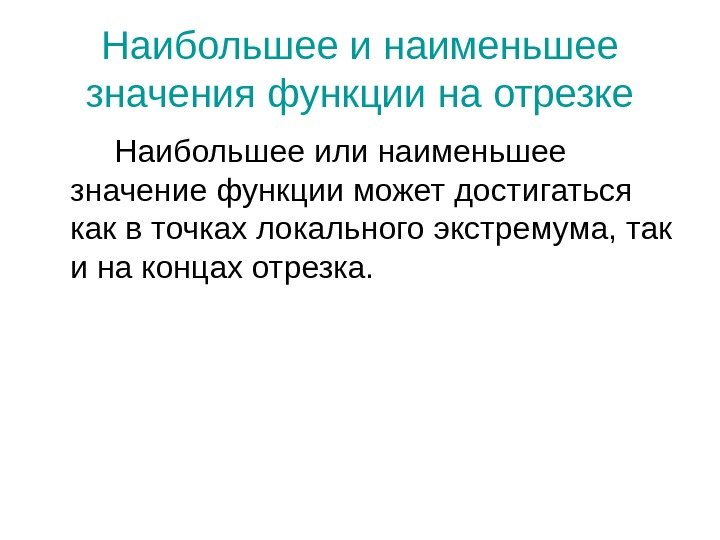 Наибольшее и наименьшее значения функции на отрезке Наибольшее или наименьшее значение функции может достигаться как в точках локального экстремума, так и на концах отрезка.