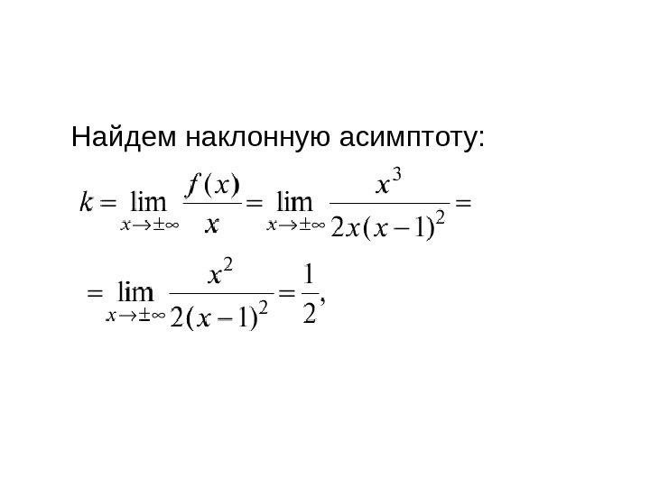 Пример. Найти наклонную асимптоту графика функции Решение. Уравнение наклонной асимптоты имеет вид: