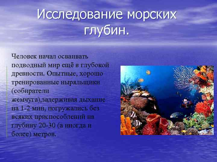 Исследование морских глубин. Человек начал осваивать подводный мир ещё в глубокой древности. Опытные, хорошо тренированные ныряльщики (собиратели жемчуга), задерживая дыхание на 1 -2 мин, погружались без всяких приспособлений на глубину 20 -30 (а иногда и более) метров.