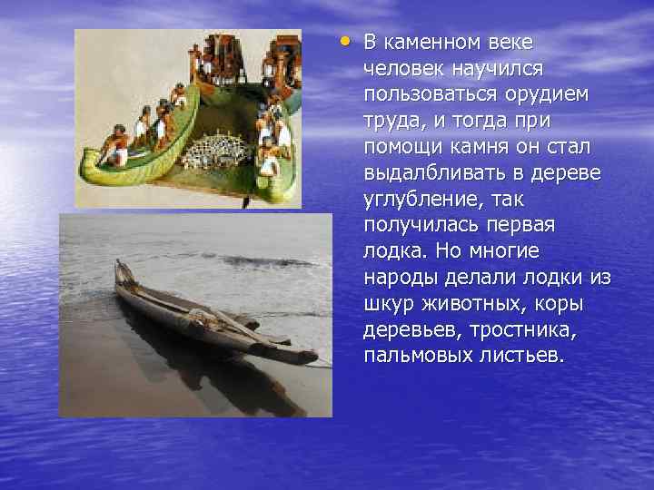 • В каменном веке человек научился пользоваться орудием труда, и тогда при помощи камня он стал выдалбливать в дереве углубление, так получилась первая лодка. Но многие народы делали лодки из шкур животных, коры деревьев, тростника, пальмовых листьев.