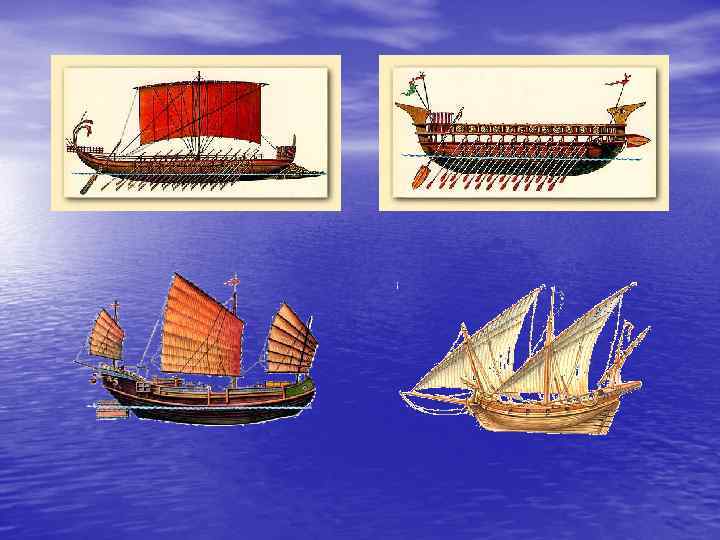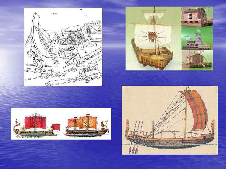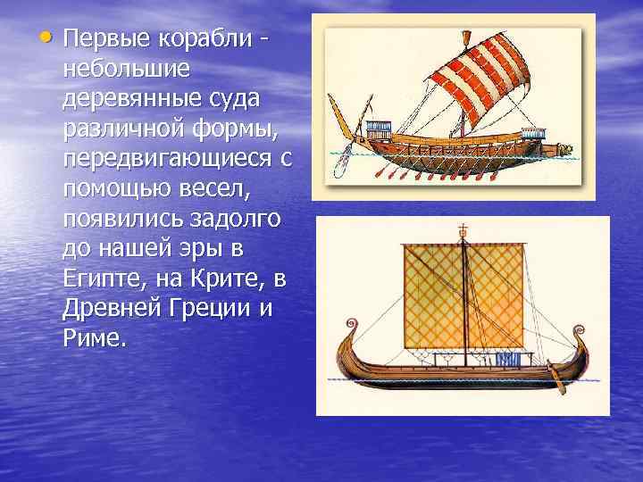 • Первые корабли - небольшие деревянные суда различной формы, передвигающиеся с помощью весел, появились задолго до нашей эры в Египте, на Крите, в Древней Греции и Риме.