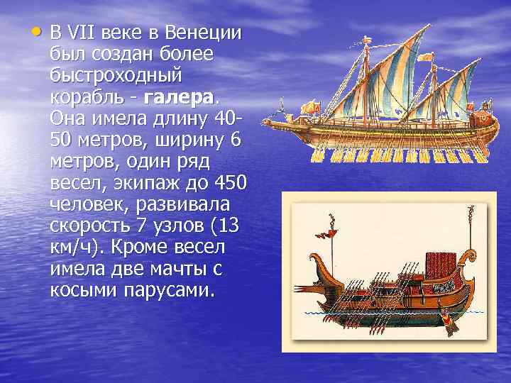 • В VII веке в Венеции был создан более быстроходный корабль - галера. Она имела длину 4050 метров, ширину 6 метров, один ряд весел, экипаж до 450 человек, развивала скорость 7 узлов (13 км/ч). Кроме весел имела две мачты с косыми парусами.