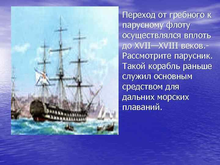 • Переход от гребного к парусному флоту осуществлялся вплоть до XVII—XVIII веков. Рассмотрите парусник. Такой корабль раньше служил основным средством для дальних морских плаваний.