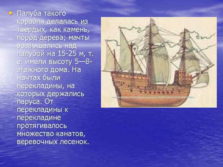 • Палуба такого корабля делалась из твердых, как камень, пород дерева; мачты возвышались над палубой на 15 -25 м, т. е. имели высоту 5— 8 этажного дома. На мачтах были перекладины, на которых держались паруса. От перекладины к перекладине протягивалось множество канатов, веревочных лесенок.