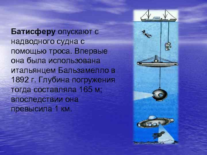 Батисферу опускают с надводного судна с помощью троса. Впервые она была использована итальянцем Бальзамелло в 1892 г. Глубина погружения тогда составляла 165 м; впоследствии она превысила 1 км.