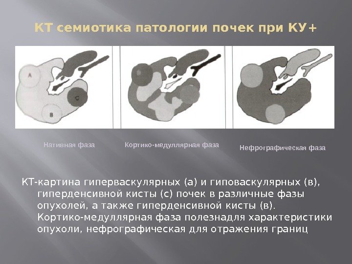 КТ семиотика патологии почек при КУ+ КТ-картина гиперваскулярных (а) и гиповаскулярных (в), гиперденсивной кисты (с) почек в различные фазы опухолей, а также гиперденсивной кисты (в). Кортико-медуллярная фаза полезнадля характеристики опухоли, нефрографическая для отражения границ Нативная фаза Кортико-медуллярная фаза Нефрографическая фаза