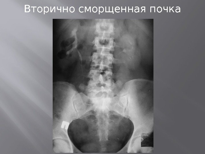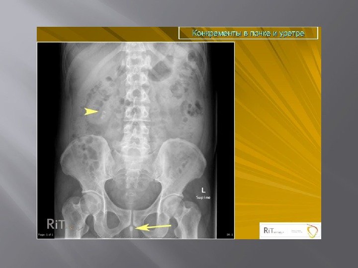 Обзорная урография Обзорная урограмма охватывает область от верхних полюсов почек до начала мочеиспускательного канала. С обзорного снимка следует начинать любое рентгенологическое обследование пациента с урологическим заболеванием. Нередко уже по обзорному снимку можно установить диагноз. При интерпретации обзорной рентгенограммы необходимо учитывать состояние скелета. Большую диагностическую ценность имеет выявление аномалий развития позвоночника (люмбализация, сакрализация, spina bifida), патологических изменений опорно-двигательного аппарата (сколиоз, деформирующий спондилез, спондилит, туберкулез, метастазов опухоли). Локализацию почек правильнее определять по позвоночнику. Контуры нормальных почек на рентгенограмме ровные и тени их гомогенные.