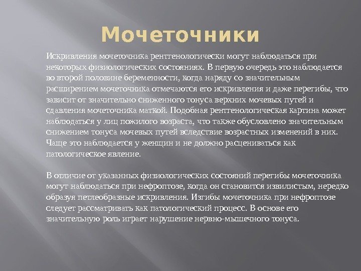Мочеточники Искривления мочеточника рентгенологически могут наблюдаться при некоторых физиологических состояниях. В первую очередь это наблюдается во второй половине беременности, когда наряду со значительным расширением мочеточника отмечаются его искривления и даже перегибы, что зависит от значительно сниженного тонуса верхних мочевых путей и сдавления мочеточника маткой. Подобная рентгенологическая картина может наблюдаться у лиц пожилого возраста, что также обусловлено значительным снижением тонуса мочевых путей вследствие возрастных изменений в них. Чаще это наблюдается у женщин и не должно расцениваться как патологическое явление. В отличие от указанных физиологических состояний перегибы мочеточника могут наблюдаться при нефроптозе, когда он становится извилистым, нередко образуя петлеобразные искривления. Изгибы мочеточника при нефроптозе следует рассматривать как патологический процесс. В основе его значительную роль играет нарушение нервно-мышечного тонуса.