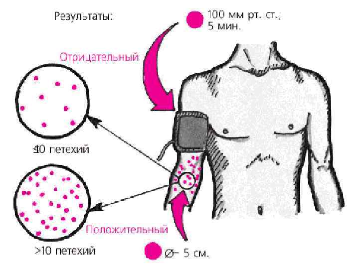 Методы исследования внешнего пути гемостаза I сосудистый компонент гемостаза 1) Проба жгута (манжетная проба): - отступить 2 см от локтевого сгиба, на внутренней поверхности предплечья очертить круг диаметром 5 см. - на плечо наложить манжету от тонометра довести давление в манежете до 90 -100 мм. рт. ст и удерживать в течение 5 мин. - снять манжету через 5 мин подсчитать количество петехий в круге