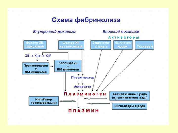 Фибирнолитическая система v Плазмин – основной фермент, расщепляющий фибрин. Фибрин (сгусток) Плазмин D и E димеры Продукты деградации фибрина