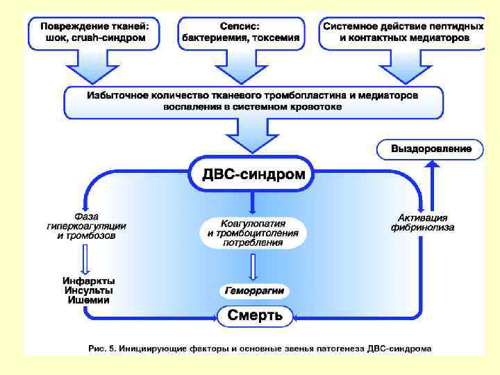 Патогенез ДВС-синдрома Повреждение (тяжелая интоксикация, шок, травма, и. т. д) Активация коагуляционного звена гемостаза Истощение факторов свертывания в плазме Тромбоцитопения Кровоточивость Повреждение эндотелия Прогрессирующая активация тромбоцитов Массивное образование тромбов на всем протяжении микроциркуляторного русла Полиорганная недостаточность