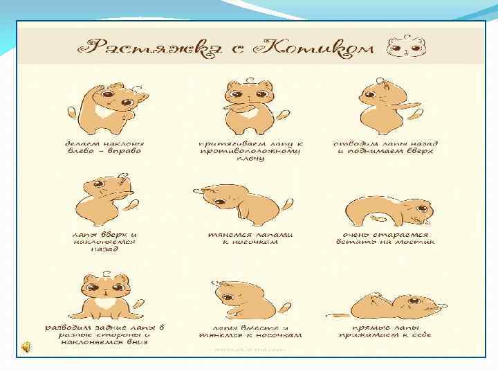 А теперь я хочу вам показать небольшой комплекс весёлых упражнений, который называется «РАСТЯЖКА С КОТИКОМ» . Для того чтобы быть здоровыми и гибкими – делайте эти упражнения во время зарядки каждый день!