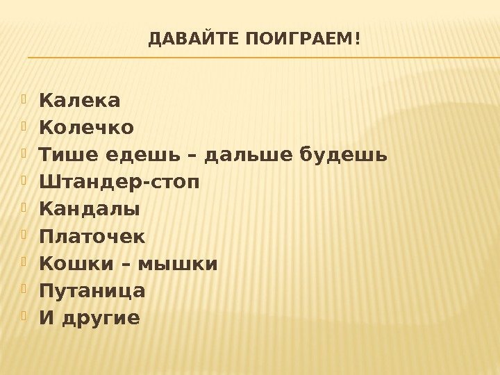 ДАВАЙТЕ ПОИГРАЕМ! Калека Колечко Тише едешь – дальше будешь Штандер-стоп Кандалы Платочек Кошки – мышки Путаница И другие