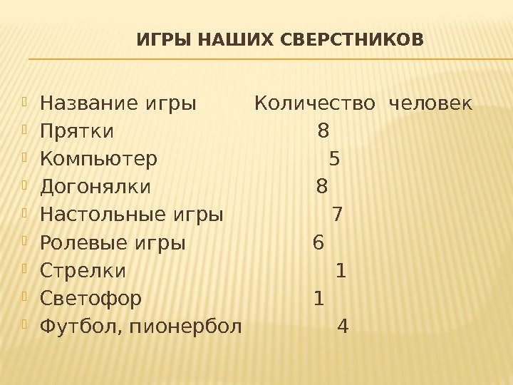ИГРЫ НАШИХ СВЕРСТНИКОВ Название игры Количество человек Прятки 8 Компьютер 5 Догонялки 8 Настольные игры 7 Ролевые игры 6 Стрелки 1 Светофор 1 Футбол, пионербол