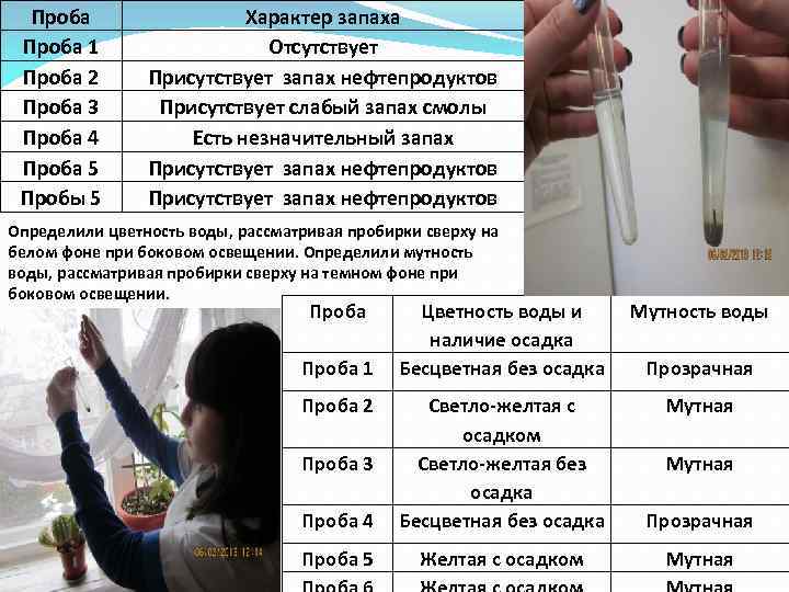 Проба 1 Проба 2 Проба 3 Проба 4 Проба 5 Пробы 5 Характер запаха Отсутствует Присутствует запах нефтепродуктов Присутствует слабый запах смолы Есть незначительный запах Присутствует запах нефтепродуктов Определили цветность воды, рассматривая пробирки сверху на белом фоне при боковом освещении. Определили мутность воды, рассматривая пробирки сверху на темном фоне при боковом освещении. Проба Цветность воды и наличие осадка Бесцветная без осадка Мутность воды Мутная Проба 4 Светло-желтая с осадком Светло-желтая без осадка Бесцветная без осадка Прозрачная Проба 5 Желтая с осадком Мутная Проба 1 Проба 2 Проба 3 Прозрачная Мутная