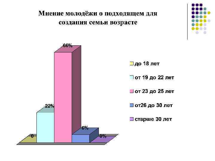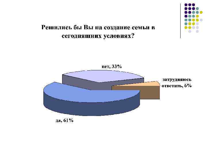 l Таким образом, исследование показало, современная молодежь ответственно относится к созданию семьи и планированию детей, считая необходимым для этого условием наличие собственного жилья и стабильный заработок. Основным мотивом создания семьи является любовь, а наличие детей в семье, по мнению молодёжи, укрепляет и гармонизирует отношения супругов. И хотя в основном молодые люди готовы создать семью в сегодняшних условиях, рожать детей они не торопятся, так как большим препятствиями для них является отсутствие собственного жилья и материально -бытовые проблемы.