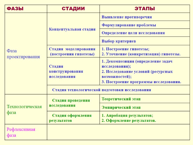 ПРОЕКТ, в т.ч. научный, включает в себя три ФАЗЫ: фаза проектирования, технологическая фаза, рефлексивная фаза. Фазы делятся на СТАДИИ, стадии на ЭТАПЫ.