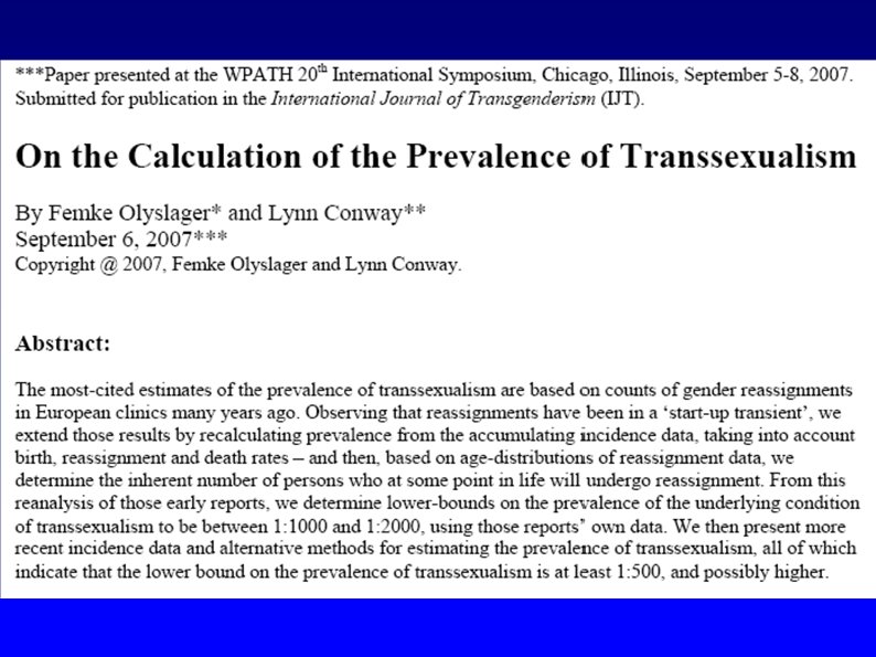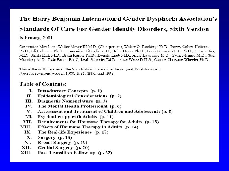 WPATH Standards of Care (SOC) § http: //www. wpath. org/ publications_standards. cfm § Online in English, Spanish and Croatian translations § De facto authoritative consensus, in constant revision