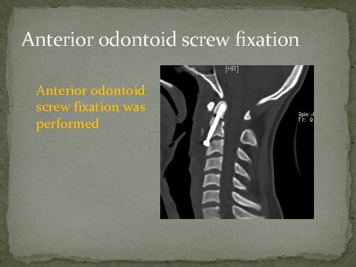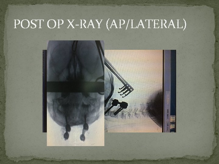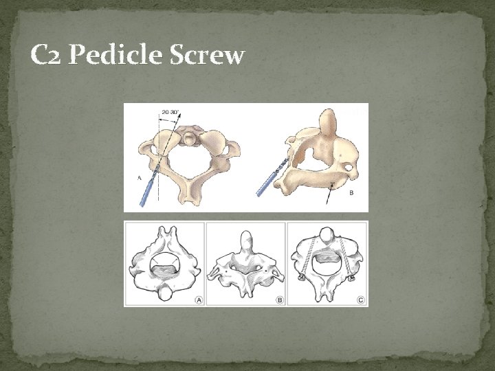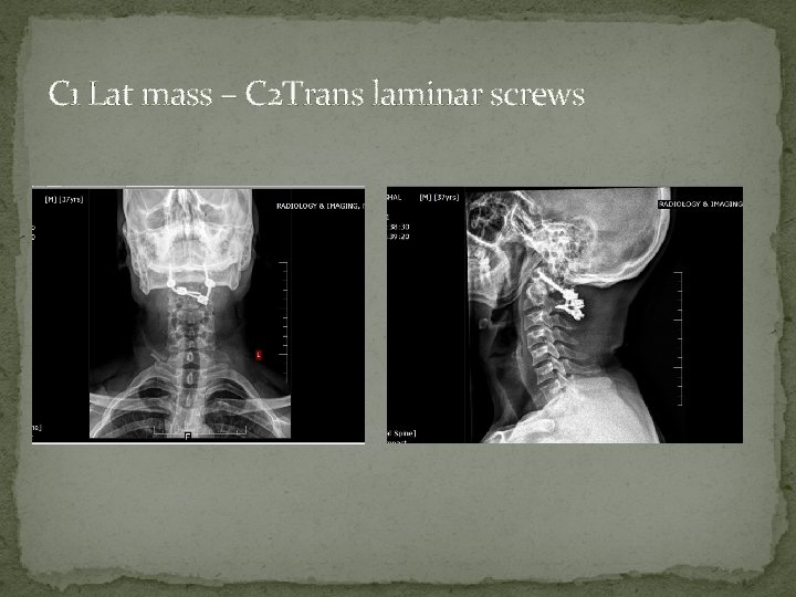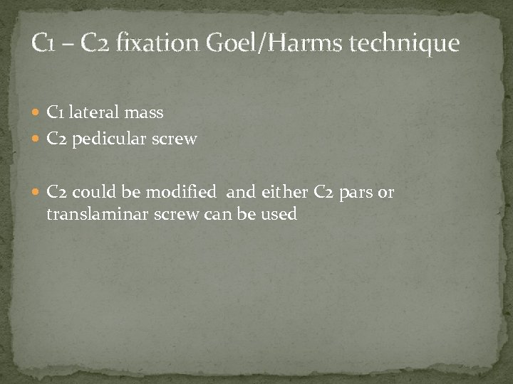 C 1 – C 2 fixation Goel/Harms technique C 1 lateral mass C 2 pedicular screw C 2 could be modified and either C 2 pars or translaminar screw can be used